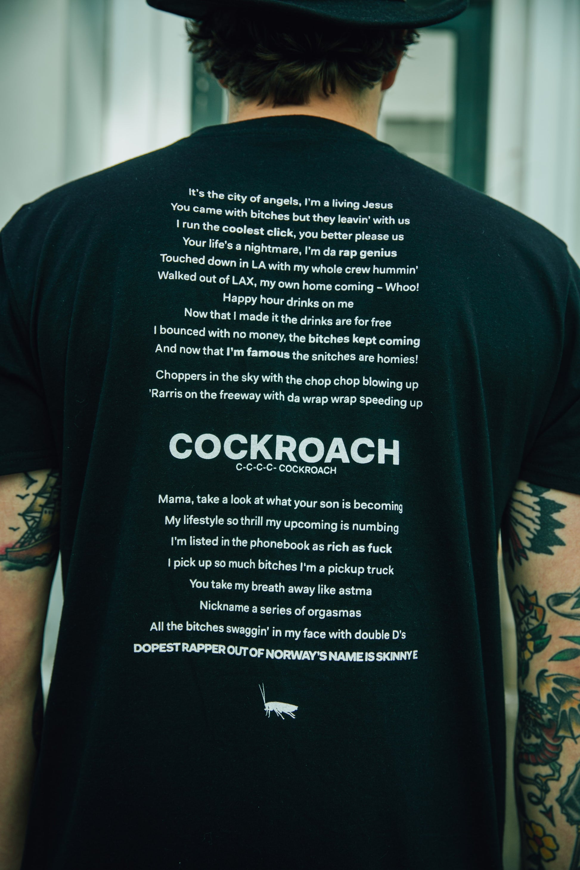 Den originale t-skjorten med print på brystet og hele låtteksten til Cockroach på ryggen.